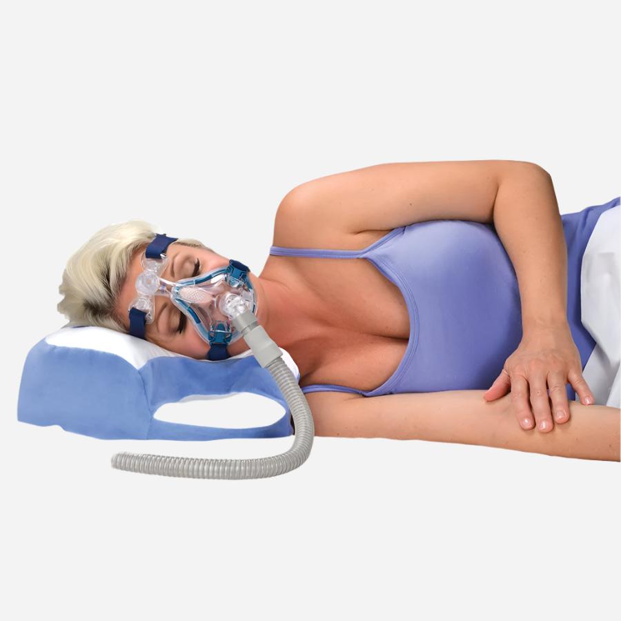 Un oreiller CPAP de conception ergonomique doté de découpes profilées pour réduire la pression du masque, améliorer l'alignement et améliorer le confort des dormeurs sur le côté, sur le dos et sur le ventre pendant la thérapie du sommeil.