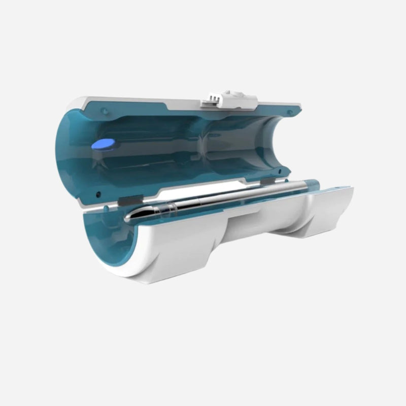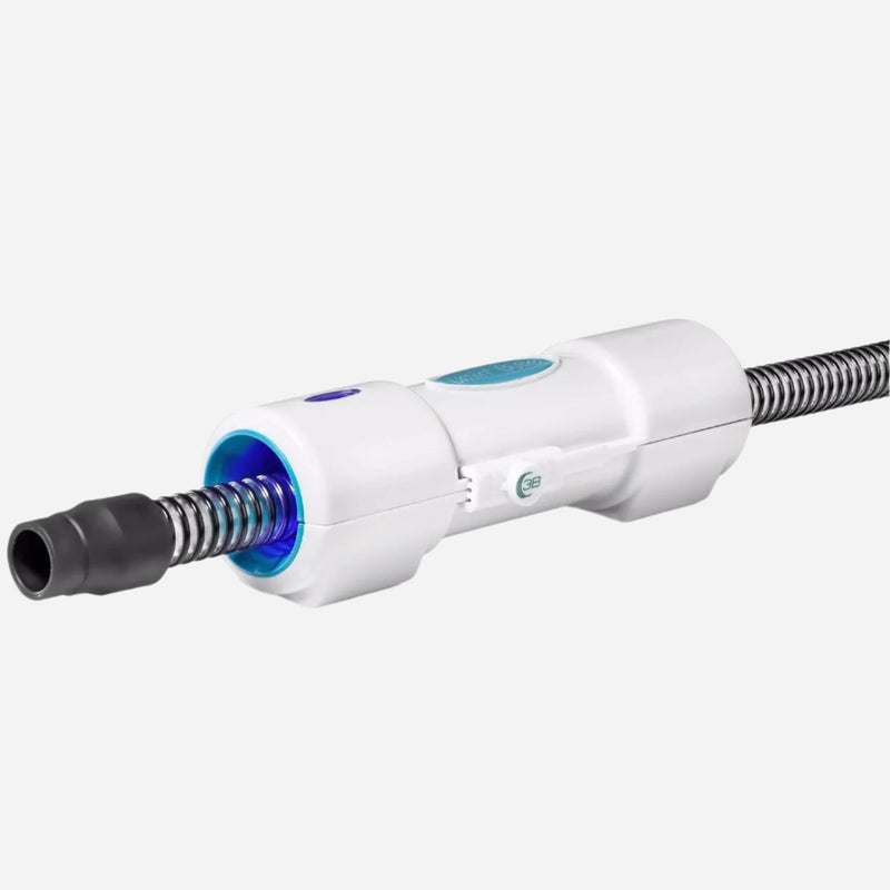 Un nettoyeur portable à lumière UV-C conçu pour désinfecter l'intérieur des tuyaux CPAP, éliminant 99,9 % des bactéries, moisissures et germes en quelques secondes sans eau ni produits chimiques agressifs.
