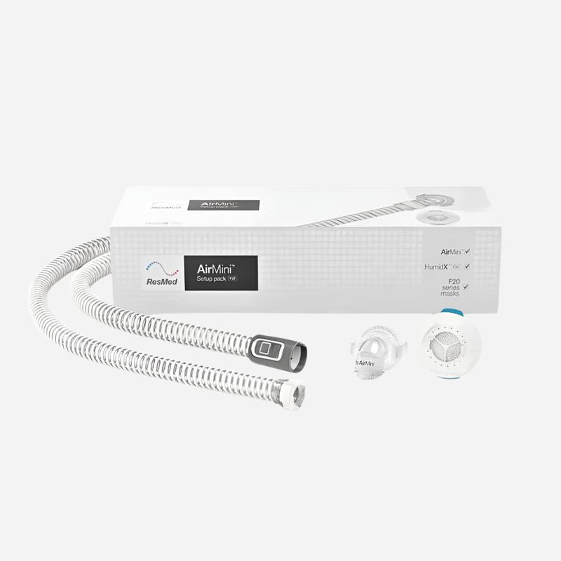 A complete CPAP travel system featuring the portable AirMini™ AutoSet™ machine, F20 mask, and a setup pack for seamless, effective sleep therapy on the go.