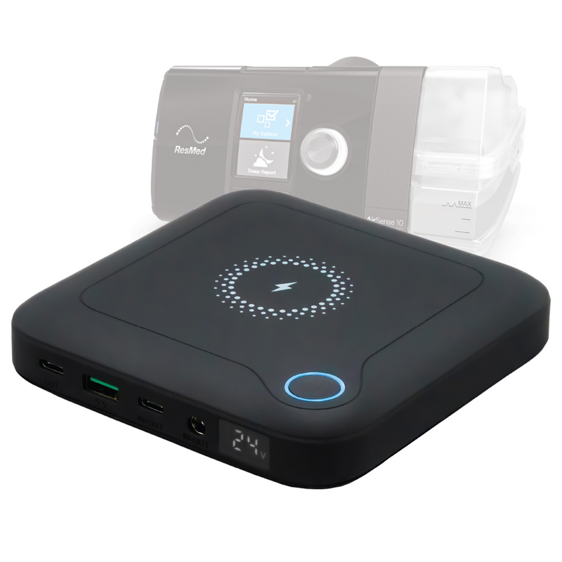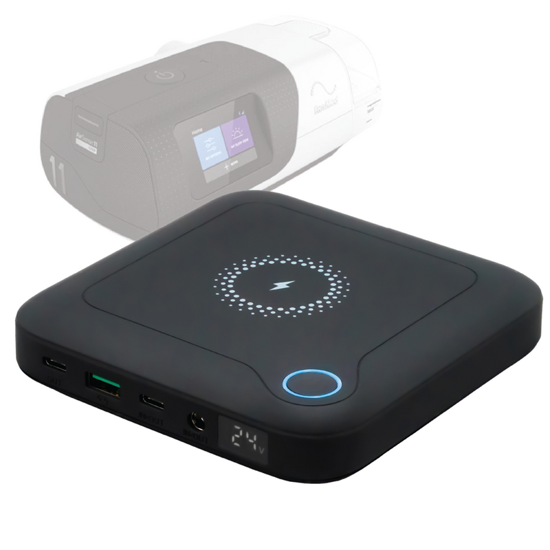 A compact, portable CPAP battery designed to provide up to 8–12 hours of backup power for uninterrupted sleep therapy, perfect for travel, camping, and power outages.