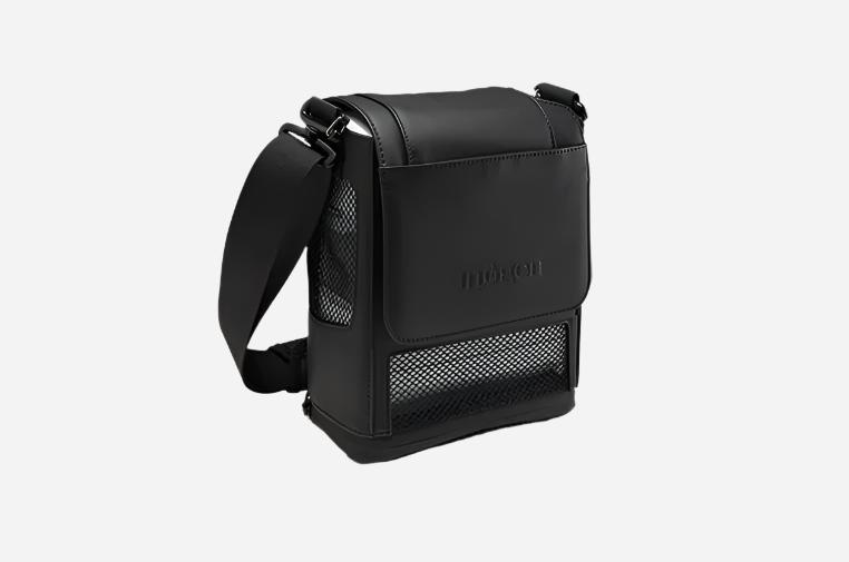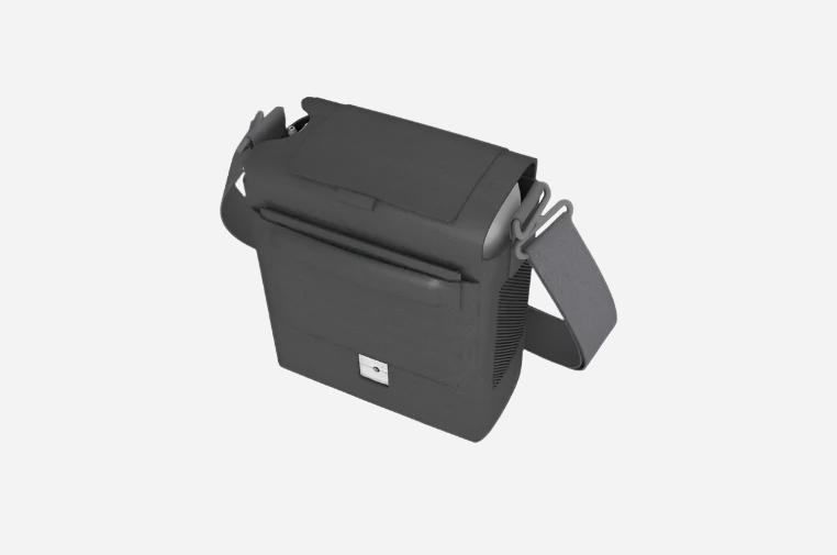 A lightweight, durable carrying bag designed to securely hold the Inogen One G5 Portable Oxygen Concentrator, featuring a padded shoulder strap and ventilation panels for convenient, hands-free portability.